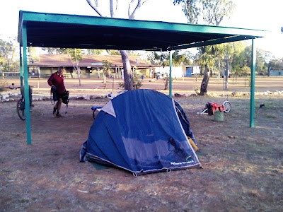 Text from Anja at Mt. Barnett WA "Whilst I sat in the stix waiting 4 Dean 2 return with a vehicle 2 rescue the broken bike...I prepared 2 set up camp 4 myself...i had time 2 amuse myself. So i was 2.7 km from the nearest water & 49 km from the nearest coke vending machine. Quiet...exept '2' crows cawwing...waiting 2 pik my flesh. felt somewhat defeated but its only desire to finish this trip at Broome is why i was feeling defeated. Those that live in moment such as aborigines & backpackers always welcome new options when theres a breakdown. So maybe it was time 2 surrender. I wondered if Murdoch would pass by & give me a hand to set up camp incase Dean didn't come back that nite. Its now 3 hrs since Clappy took off....."